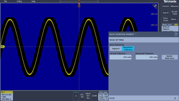 Njengengxenye yokuzibophezela kwethu ekuhlinzekeni ngezithuthukisi zomkhiqizo ezicelwe kakhulu amakhasimende ethu, i-oscilloscope engu-3 Series MDO manje ihlanganisa Ukuhlolwa Kwemaski/Umkhawulo. Lokhu kuvumela onjiniyela ukuthi bachaze izimo zokuqhathanisa eziyinkimbinkimbi ezikhomba izindlela zokuhluleka okunzima ukuzithola.